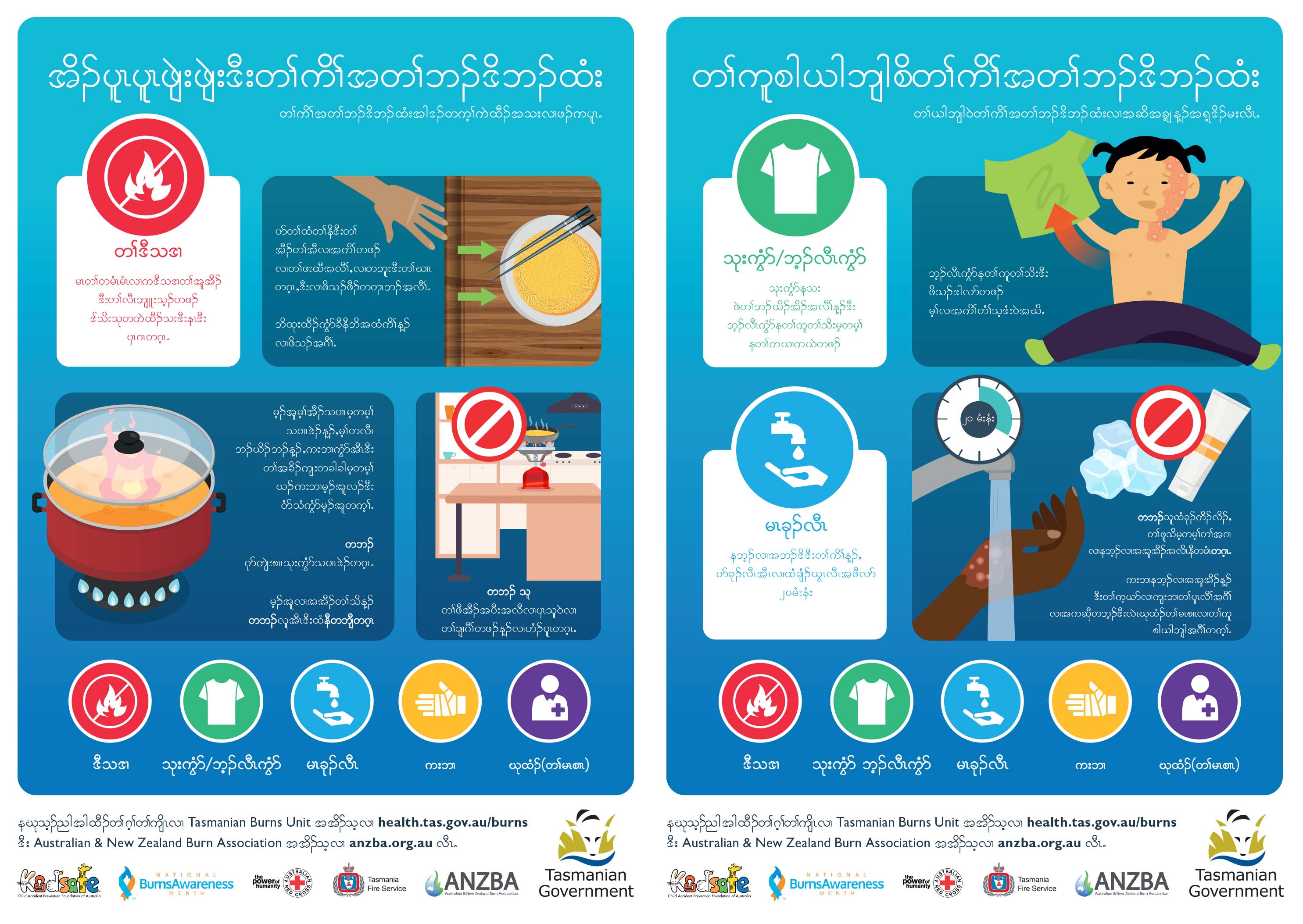 This program provides information on burns prevention and first aid for families that have recently arrived to Tasmania. The Tasmanian Burns Unit at the Royal Hobart Hospital partnered with the following agencies to deliver this material: Public Health, Department of Health Tasmania; Kidsafe; Migrant Resource Centre; RedCross; Tasmanian Fire Service and the Australian and New Zealand Burns Association (ANZBA). The project also received a Kidsafe National Burns Awareness Month grant. The focus of the project was to provide a translated resource for individuals and families arriving in Tasmania on a skilled migrant visa, Refugee and humanitarian visa and international students.